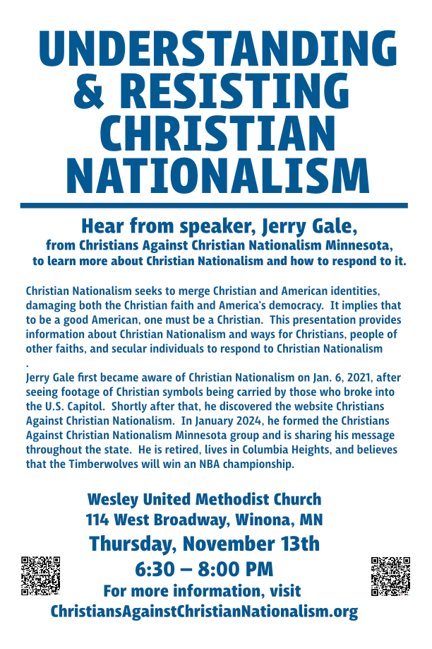 This website has published two articles about Christian Nationalism (see https://winonadfl.org/2024/06/26/christian-nationalism-not-christian-not-good-for-the-nation-says-winona-pastor/ and https://winonadfl.org/2025/07/28/local-pastor-doesnt-see-christ-in-christian-nationalism/). Now, we have an opportunity to interview Jerry Gale, who is coming to Winona on November 13 to give a talk on the subject. The talk is titled “Understanding and Resisting Christian Nationalism,” and will be held at the Wesley United Methodist Church on Broadway, starting at 6:30 PM.