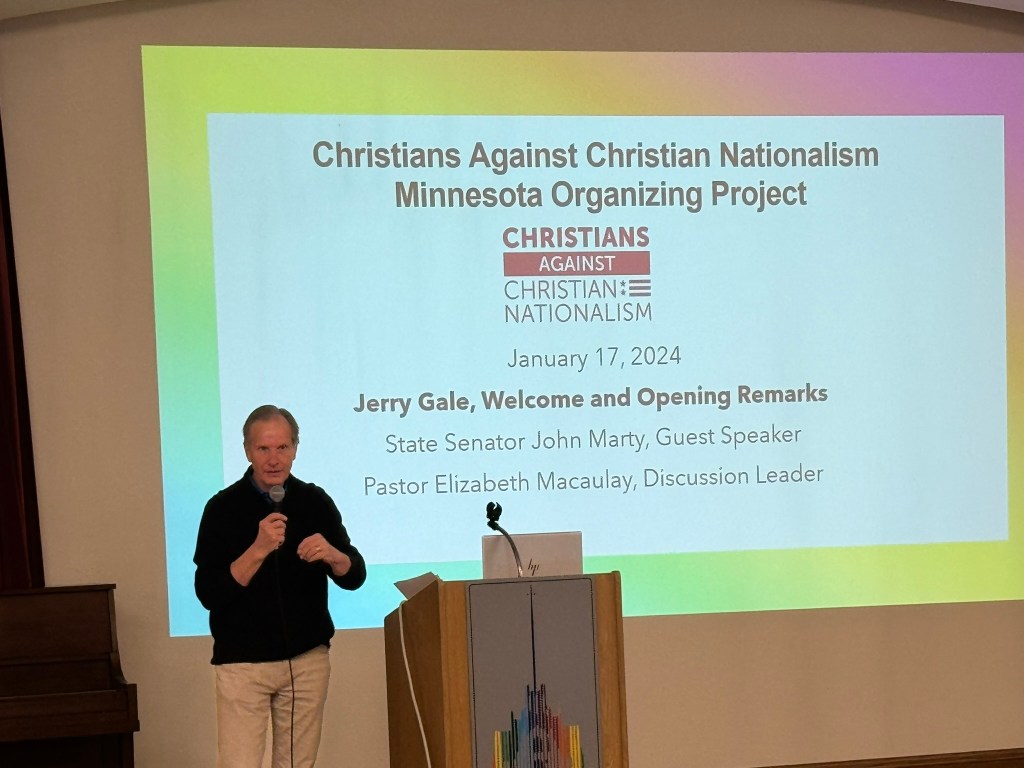 The Baptist Joint Committee has been around since 1934 and has acted as an advocacy group to protect religious liberty in America, but had not done community organizing. Jerry, who worked on the campaigns of Tim Walz, Amy Klobochar, Dean Phillips, and the late Melissa Hortman, realized he could help them with this. He approached the group, and they agreed to help him start Christians Against Christian Nationalism Minnesota in 2024. Since then, Jerry has been travelling across the state, giving talks to whoever will listen.