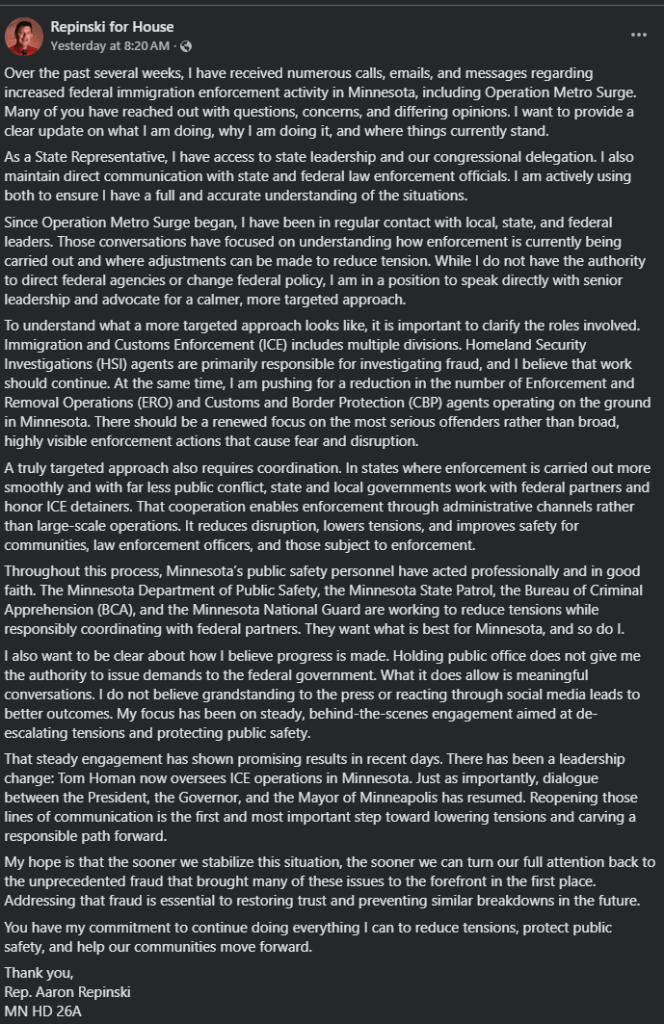 Our local Representative, Aaron Repinski, has finally responded to the recent invasion of Minnesota by ICE and Border Patrol agents–an invasion that has resulted in the shooting death of two Minnesota citizens–by cutting and pasting a statement obviously provided by higher-ups. How do we know? His Facebook post is exactly the same as one put up by Rep. Terry Stier who represents district 22B, just North East of Mankato. {SEE EXAMPLES HERE}