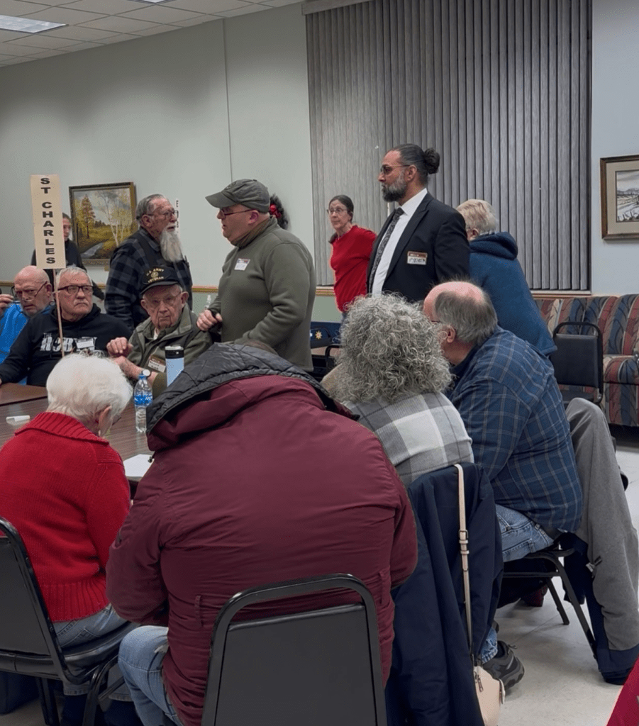 Caucus attendees in St. Charles chat with Michael Hutchison (center), DFL candidate for HD 20B.