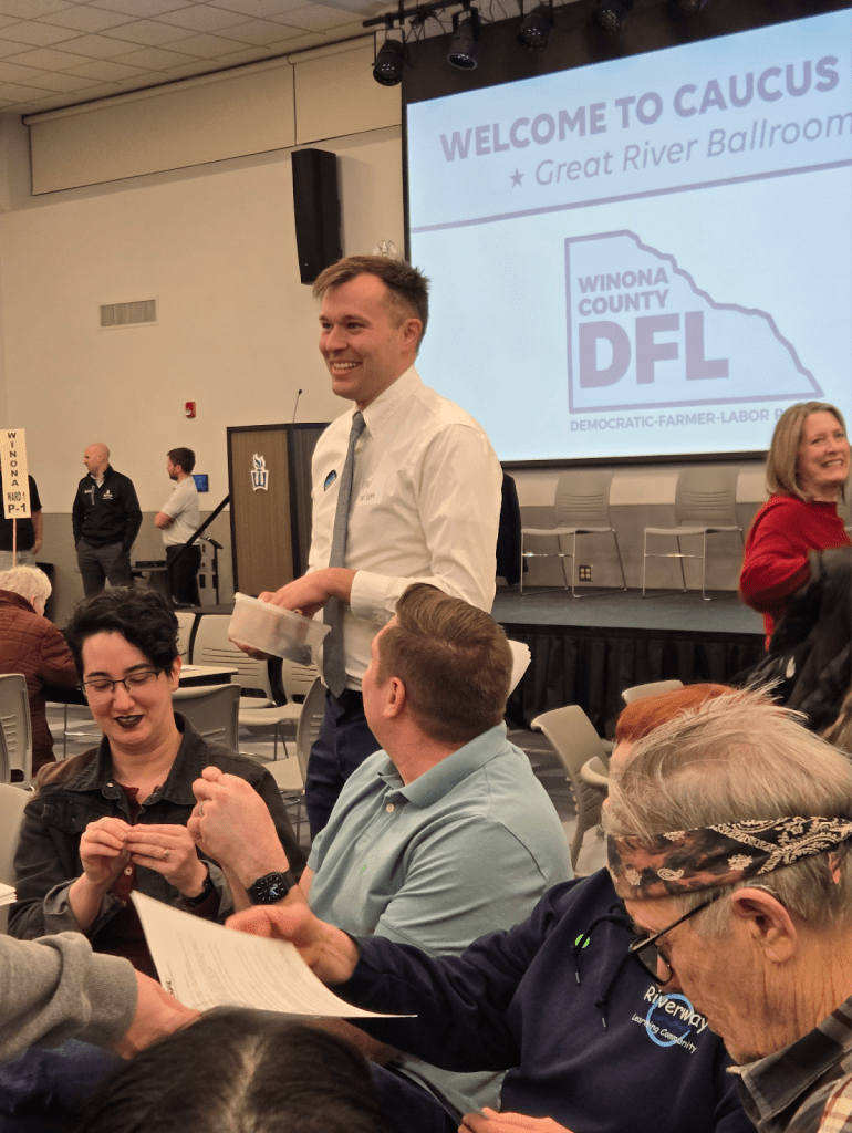 Minnesota House candidate Dan Wilson chats with caucus goers in Winona.